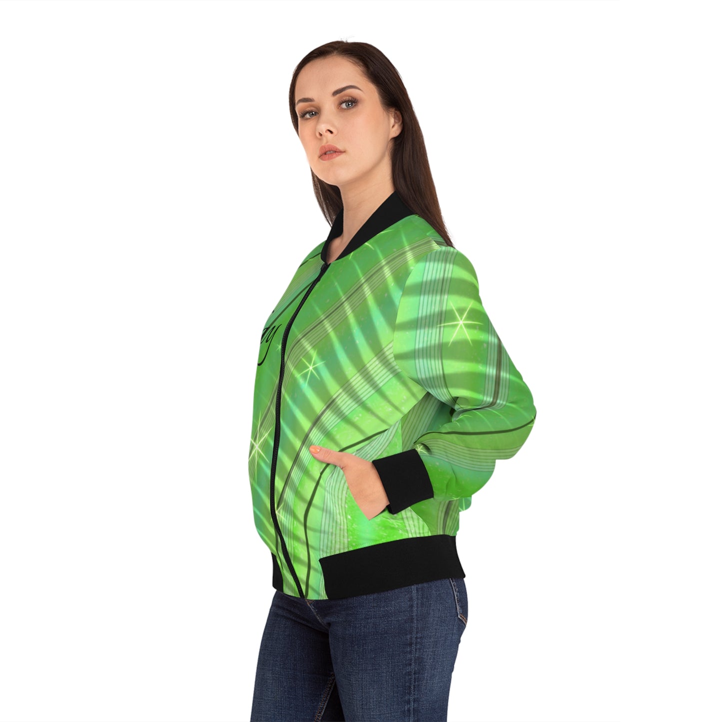 Few items are as iconic as the bomber jacket - and this one takes things to a whole new level. Featuring a stand-collar type, ribbed cuffs, collar, and hem, it's as durable as it's comfortable. Add your custom, all-over-print ideas to this women's bomber jacket and make it cute, badass, or both.